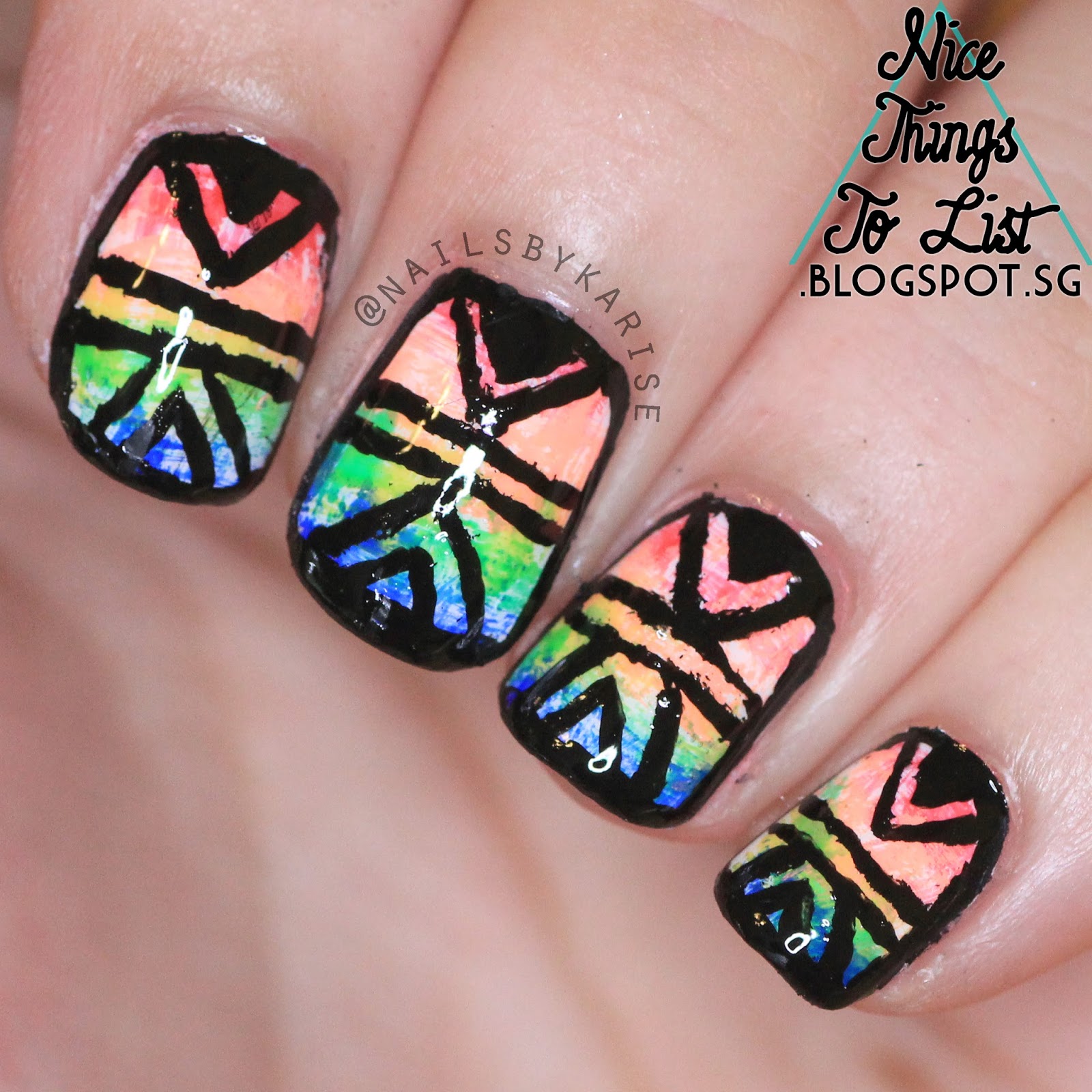 I asked Breanne of @beaninenails on instragram and she kindly agreed to do one inspired by Christine from @simplynailogical. It is this nail art whereby the background is in rainbow colors and it is done using the dry brush technique, cool eh? This was how ours turned out :)